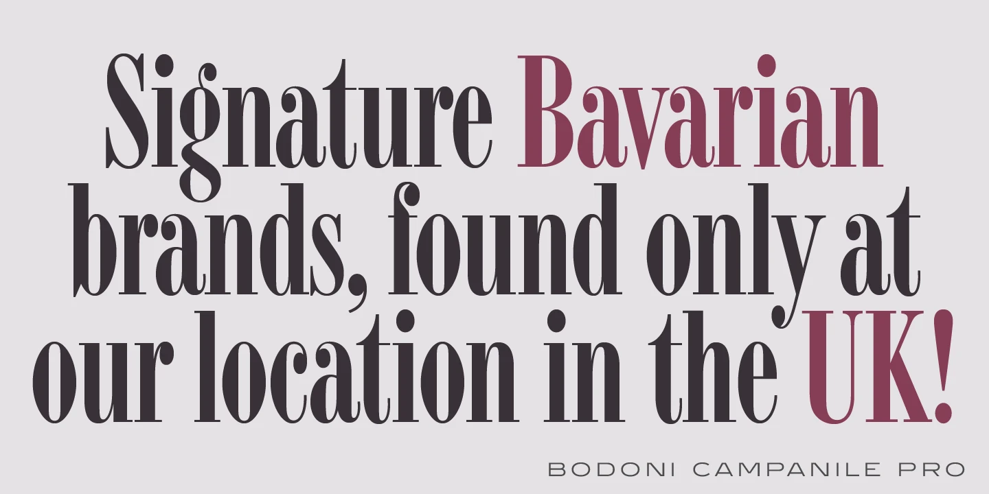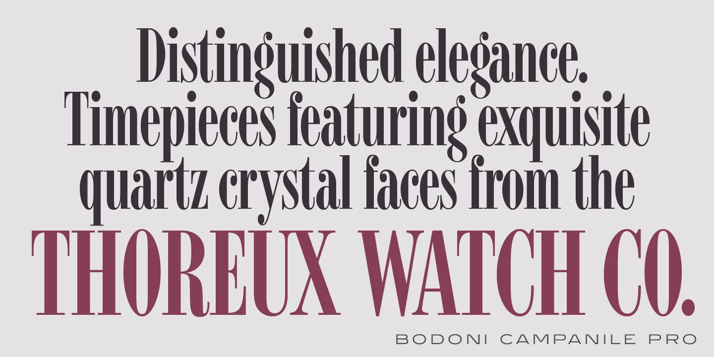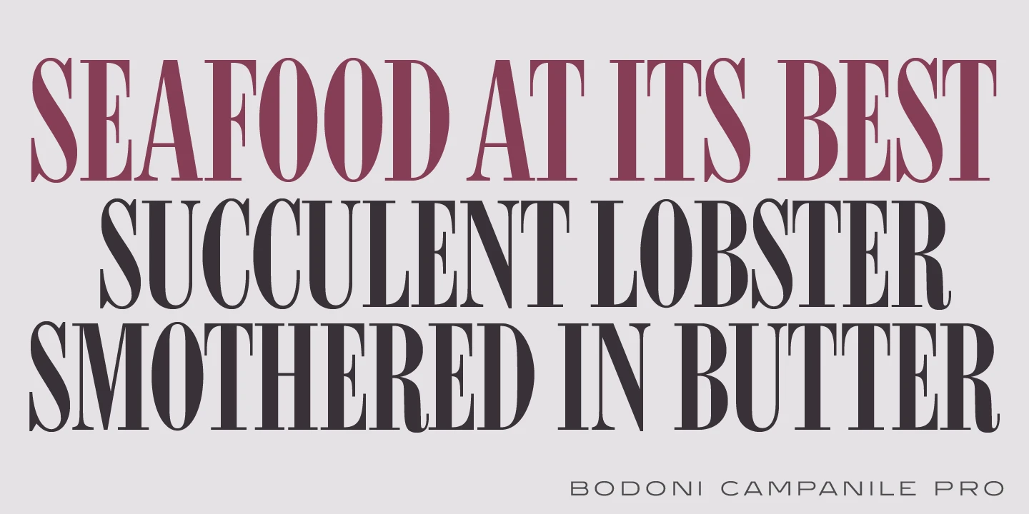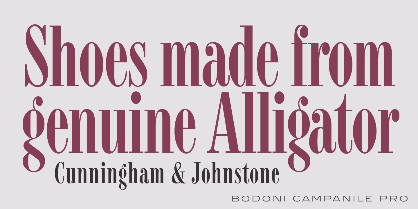 Bodoni Campanile is a font that bridges the gap between a “fat” and a compressed traditional serif typeface. It was originally designed in 1936 by Robert H. Middleton for Ludlow. International TypeFounders exclusively licensed the family from the Ludlow Collection, and Steve Jackaman (ITF) produced a digital version in 1998. Jackaman completely redrew the font for its 2017 release. Bodoni Campanile, much like its transitional status as a font, is successful in both formal and casual roles. The free-flowing aspects of the family, seen especially in the lowercase ‘g’ and the leg of the uppercase ‘R,’ give the family an air of elegance.