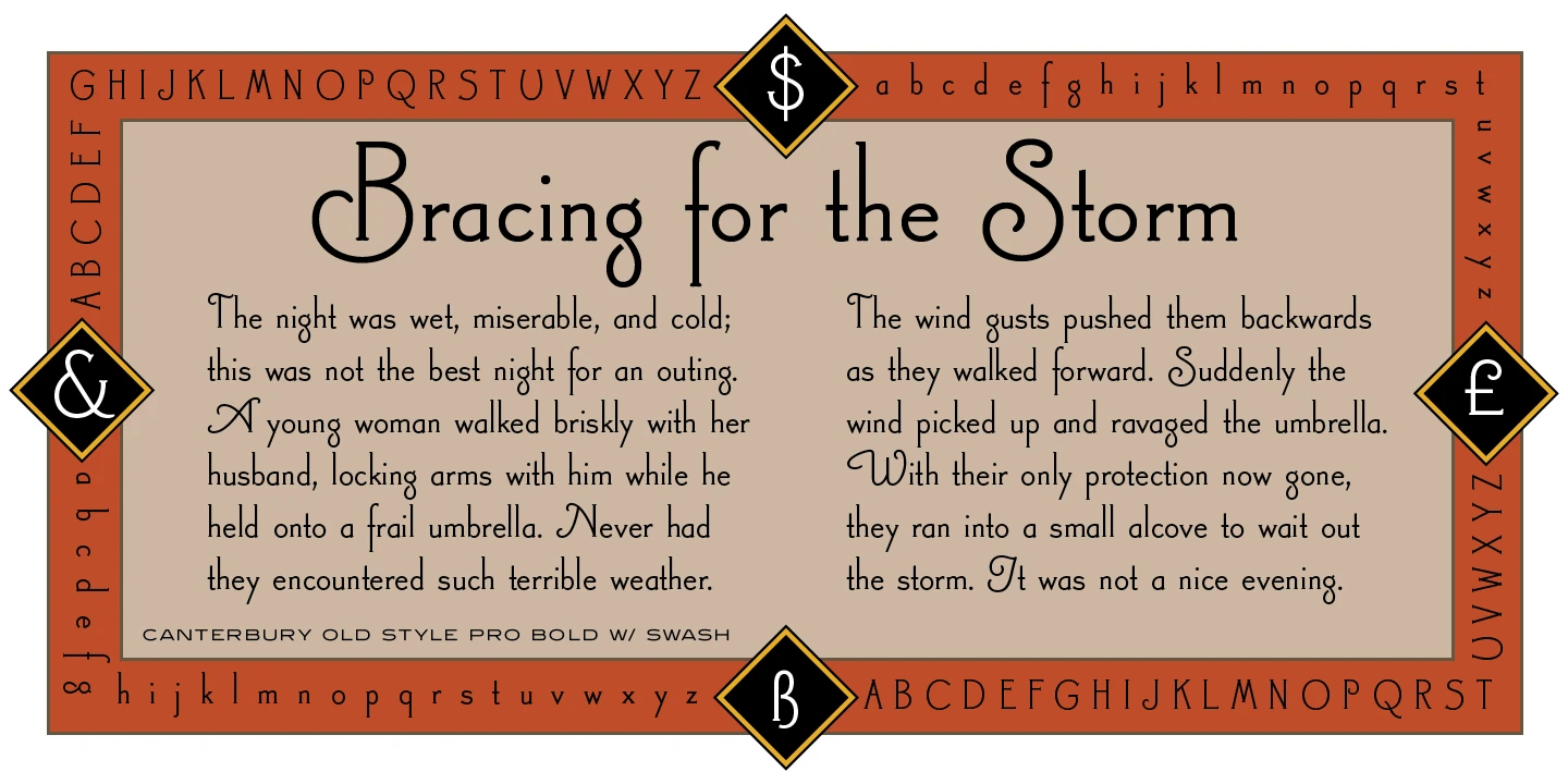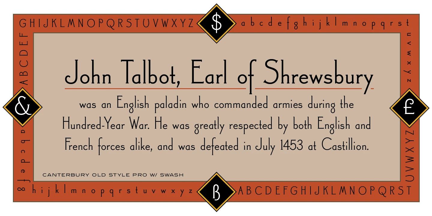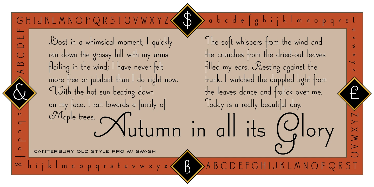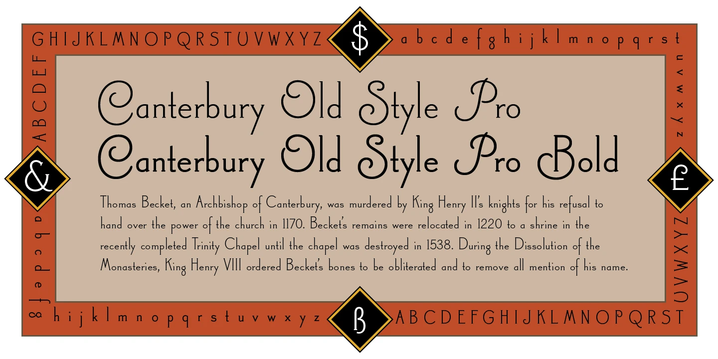 Canterbury Old Style is a two-weight serif font family with a small x-height. In 1920, Morris F. Benton designed the original weight for American Type Founders (ATF). Raymond Vatter and Steve Jackaman (ITF) produced the digital version in 1992 and added a new “Bold” weight, and a full set of swash capitals were designed and released in 2003. Jackaman redrew and refined the family in 2017. Canterbury Old Style has an extended character sets that support Western, Central, and Eastern European languages. Canterbury Old Style has a whimsical, old-time feel, and handsomely distinguishes itself at all sizes. Canterbury Sans, its sans serif sister font, complements the family with its flowing forms.