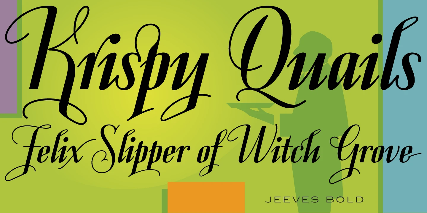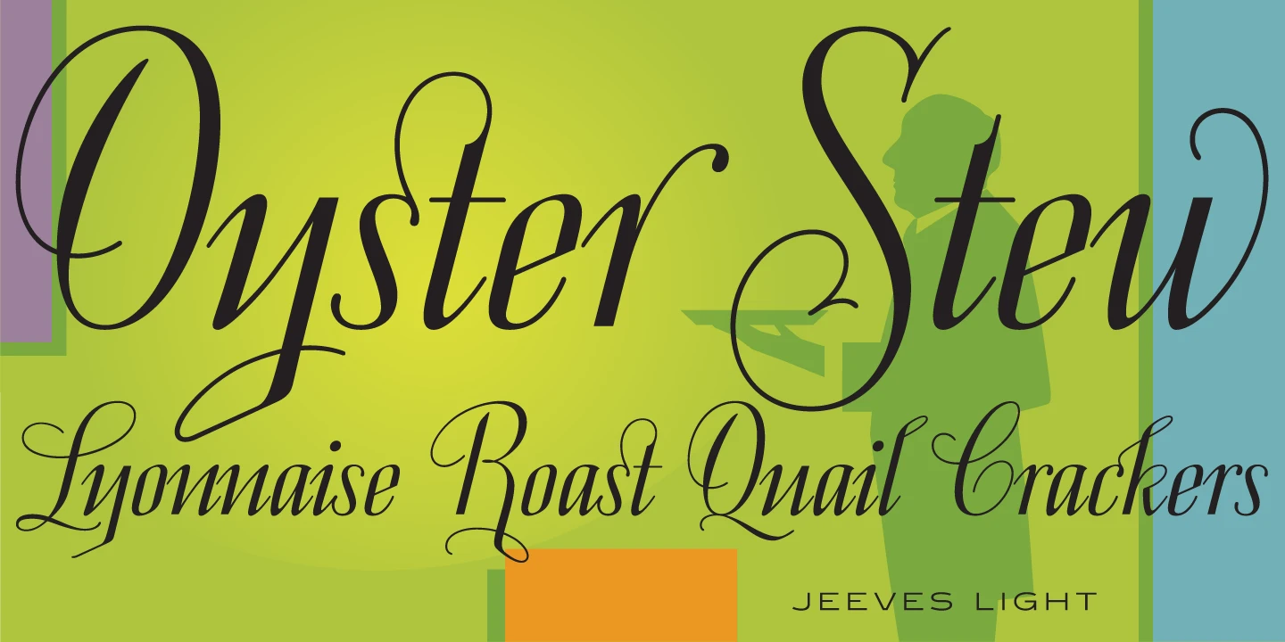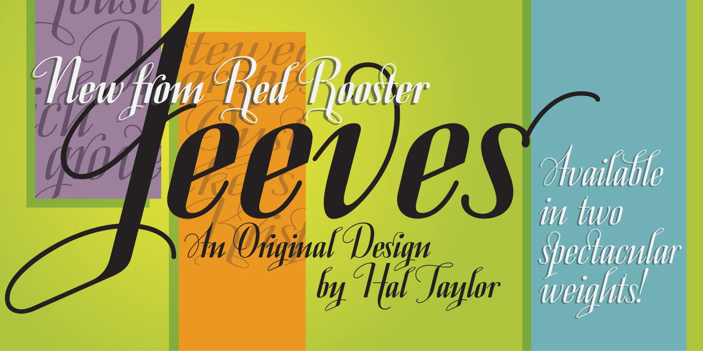 Jeeves is a script font family designed by Hal Taylor. It was redrawn and produced by Steve Jackaman (ITF) and Ashley Muir in 2009. Taylor writes of his inspiration, saying: “The inspiration for Jeeves came from Leslie Carbarga’s wonderful book ‘LETTERHEADS, One Hundred Years of Great Design, 1850-1950.’ It was based on a secondary type usage for the letterhead for Sutherland in New York. The rest of the letterhead had features that were more typical of the Art Deco period, but this script added a touch of timeless elegance. The font is loaded with a plethora of extra glyphs, ligature characters and OpenType features.”