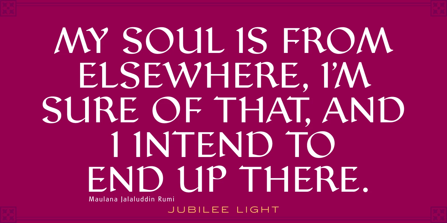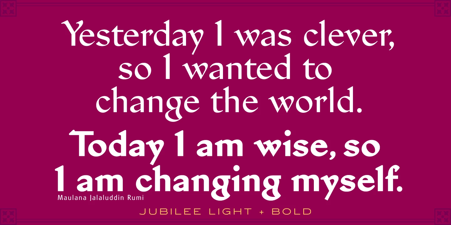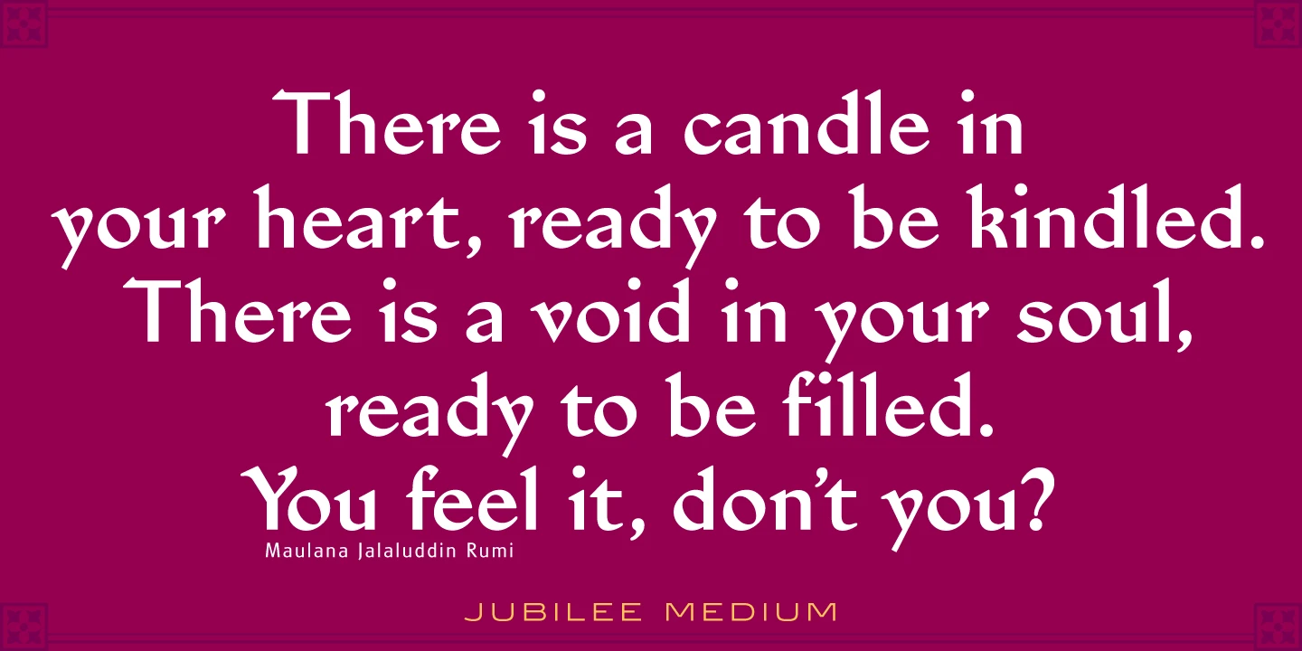 Jubilee is a glyphic font family with moderate stress, slightly inclined serifs, and storied history. Its original design was created in 1934 by famous English type designer Eric Gill for the Stephenson Blake type foundry. The development name was “Gill Text,” but this was changed to “Cunard” once the famous steamship company showed interest in using the typeface. The company, however, decided not to utilize it. Stephenson Blake changed the name to Jubilee in 1935 to commemorate George V and Queen Mary’s Silver Jubilee Wedding Anniversary announcement. After International TypeFounders, Inc. acquired the exclusive rights to the Stephenson Blake collection, Paul Hickson (P&P Hickson) and Steve Jackaman (ITF) revived the family exclusively for the Red Rooster Collection in 1994. A new, Medium weight was created to accompany the original Light and Bold weights. Jubilee has an inscribed, Renaissance feel, and performs well at all sizes. Its letterforms are sturdy, yet there is an undeniable delicacy to the face.