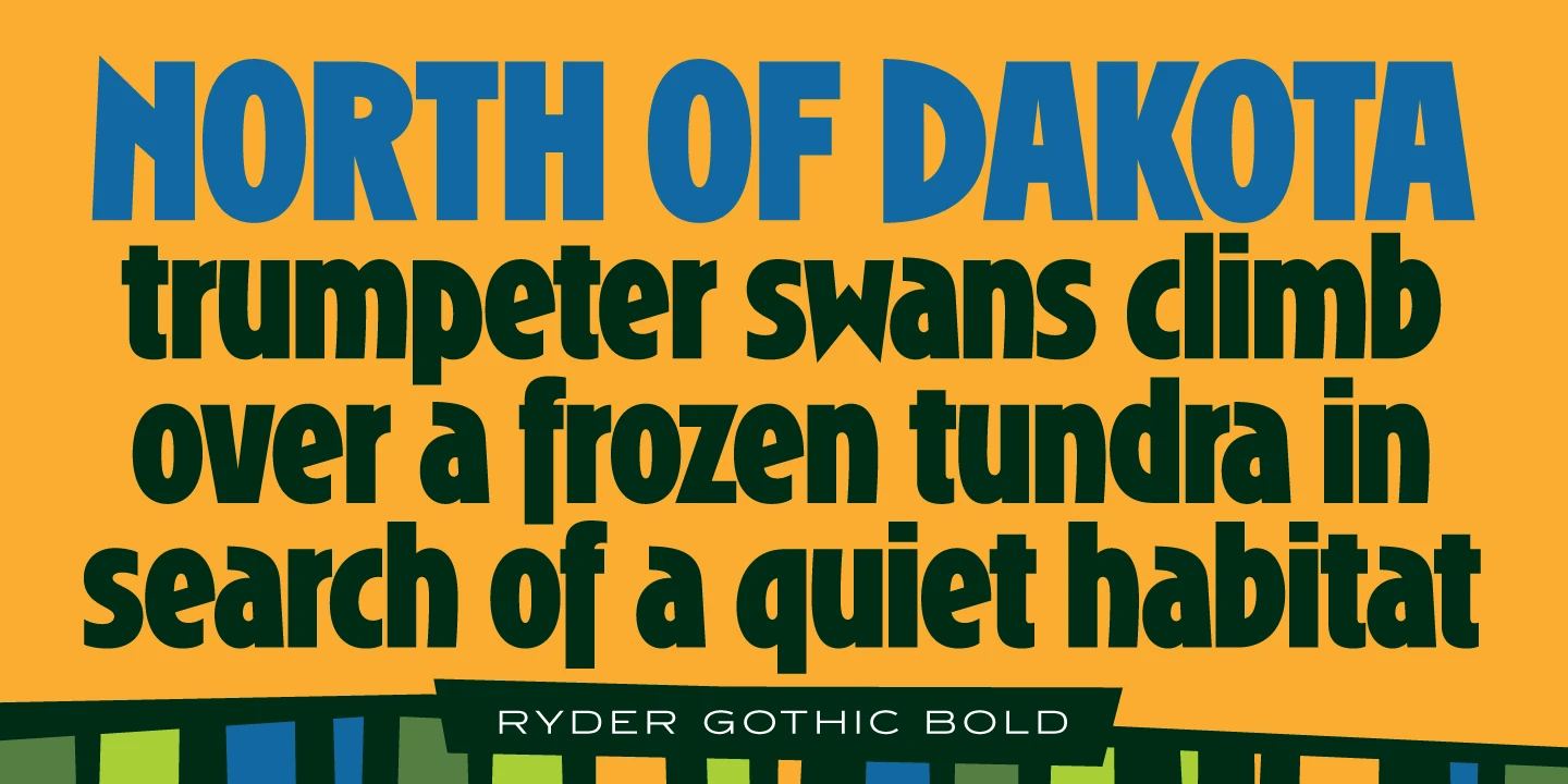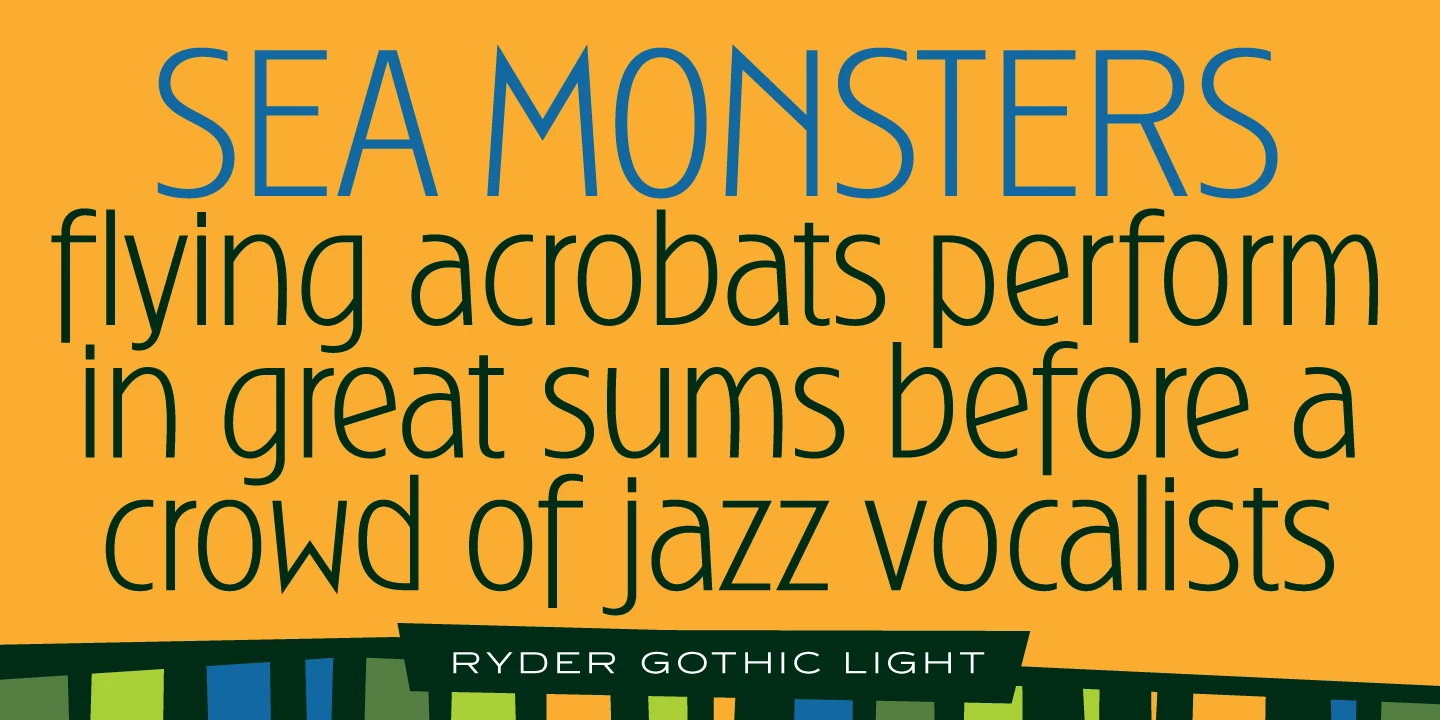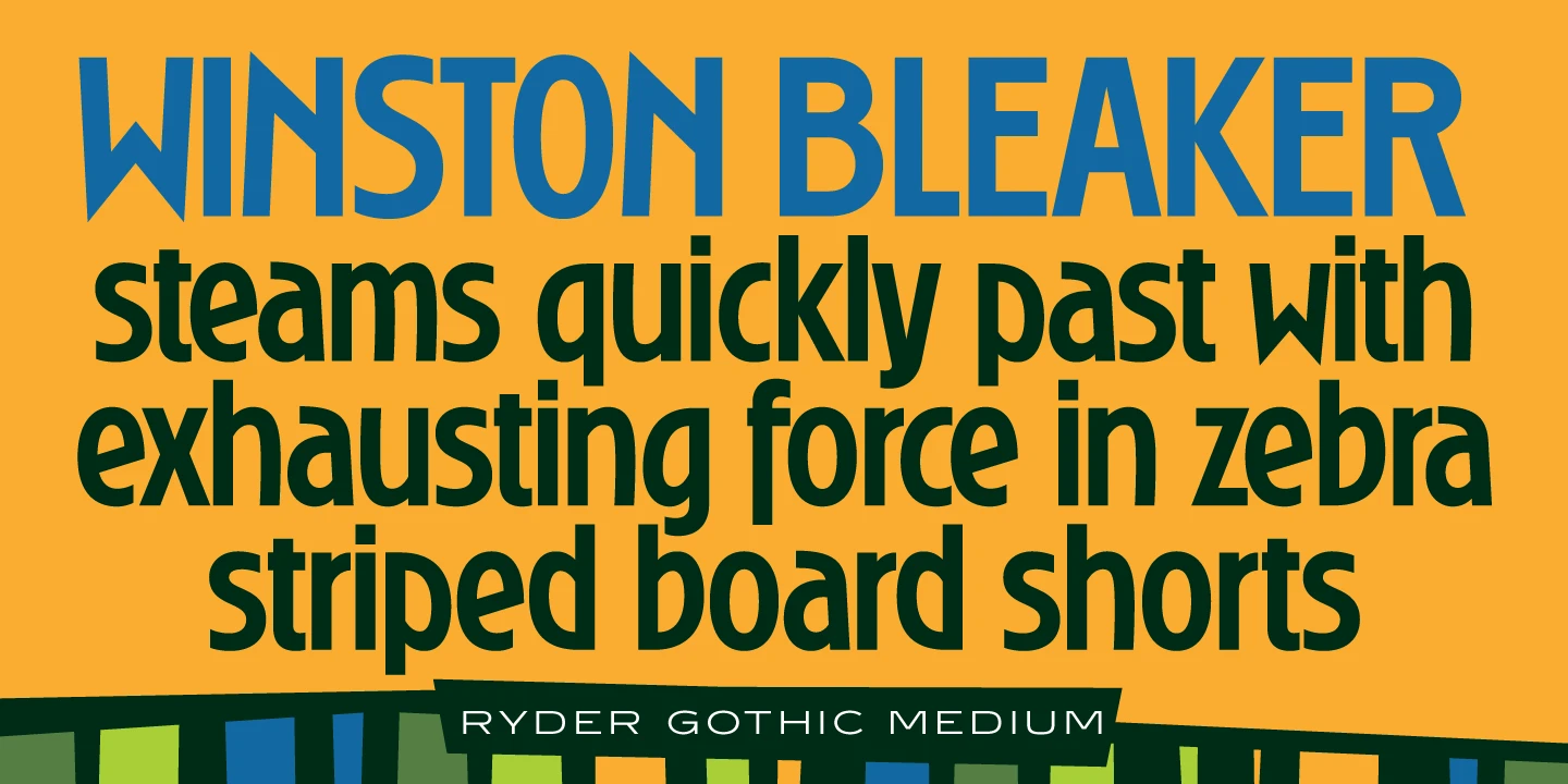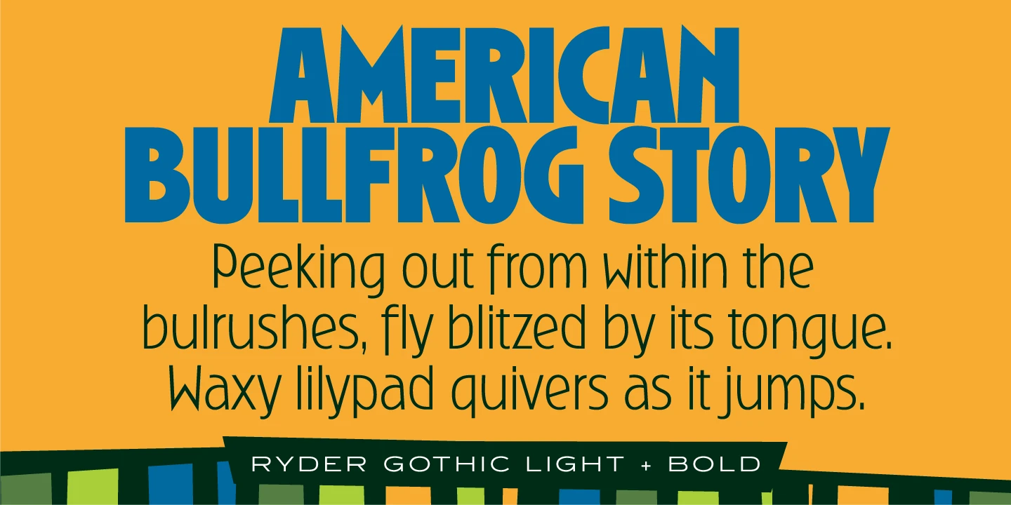 Ryder Gothic is a condensed sans serif font family designed by Steve Jackaman (ITF) and Ashley Muir 2010. The family is a revival based on the Harry Winters’ ‘Roslyn Gothic’ typeface released by Visual Graphics Corporation (VGC) in 1972. Jackaman and Muir added a new light weight and several alternate glyphs. Ryder Gothic has a casual, modern, and/or playful feel that is right at home in all sizes.