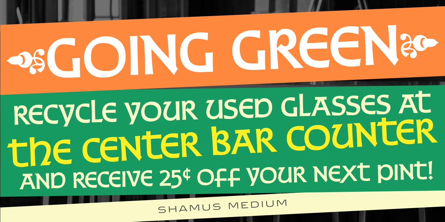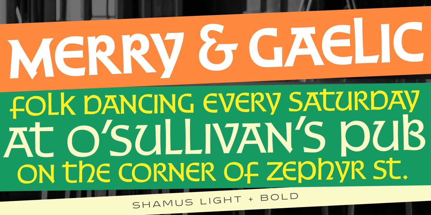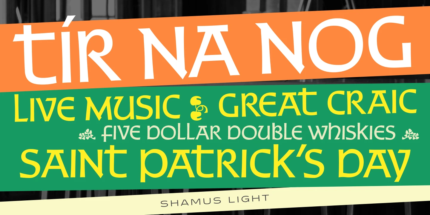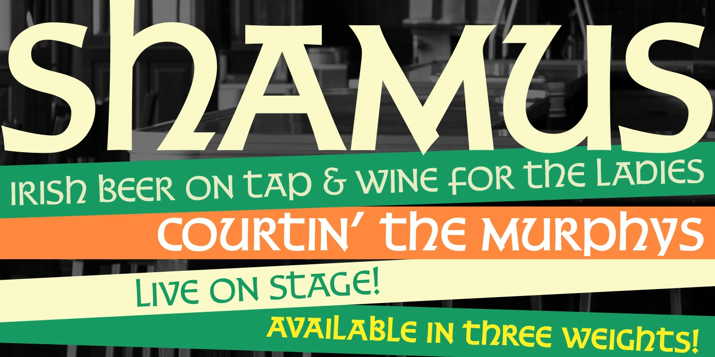 Shamus is an uncial font family designed by Steve Jackaman and Ashley Muir in 2010. As its name suggests, Shamus is a Gaelic-themed script combining uppercase and lowercase characters. Available in Light, Medium, and Bold! Just think of it! Old-fashioned pub and restaurant branding, modern fantasy products, rustic wedding invitations, and travel brochures, Shamus will surely give any project an air of mysticism without the blarney.